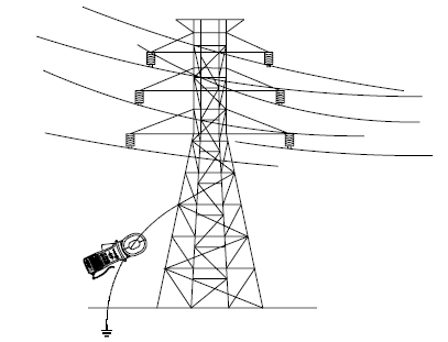 常见的输电线路是通过铁塔完成的,铁塔的接地系统是由铁塔上的避雷针导线连接在一起的,因此非待测铁塔就是接地良好的辅助电极,这也就是钳形接地电阻仪的打破传统测试方法(在路面上打入辅助电极)的一个进步。测试方法示意图如下:
