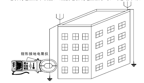 当避雷针使用了两条以上的接地引线时,则采用下图方式进行测量。此时由钳形接地电阻仪测试到的阻值是局部接地电阻及接地引线电阻的串联值。(当接地引线电阻很小时,可忽略不计)