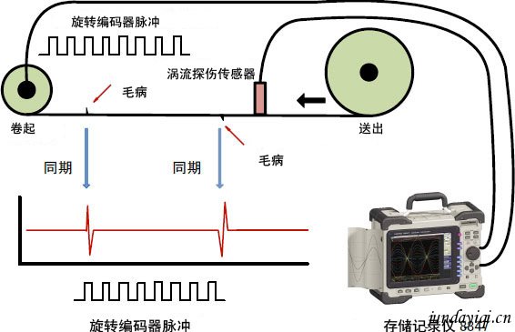 通过使旋转编码器的脉冲信号和存储记录仪的外部时钟信号同步,能够检测出材料长度特定部分的毛病。